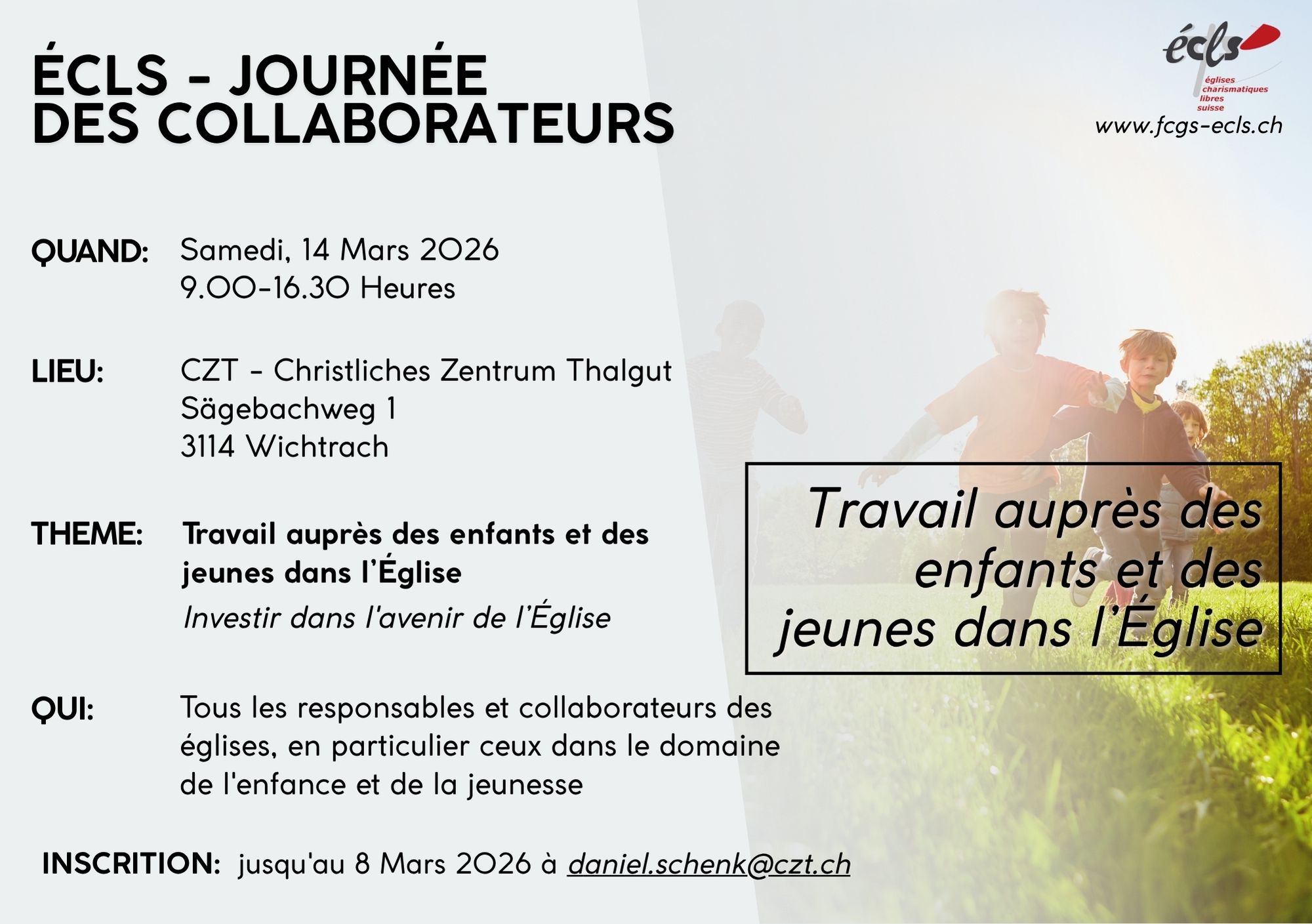 Culte & programme pour les enfants, suivis d'un repas et de la communauté Enregistrement: via sa propre église ou info(at)cet.ch